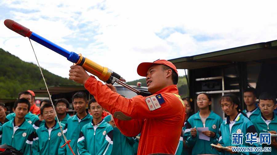 森林消防員向學生們展示水域救援裝備(攝于6月29日)。新華網發(云南省森林消防總隊保山支隊供圖)