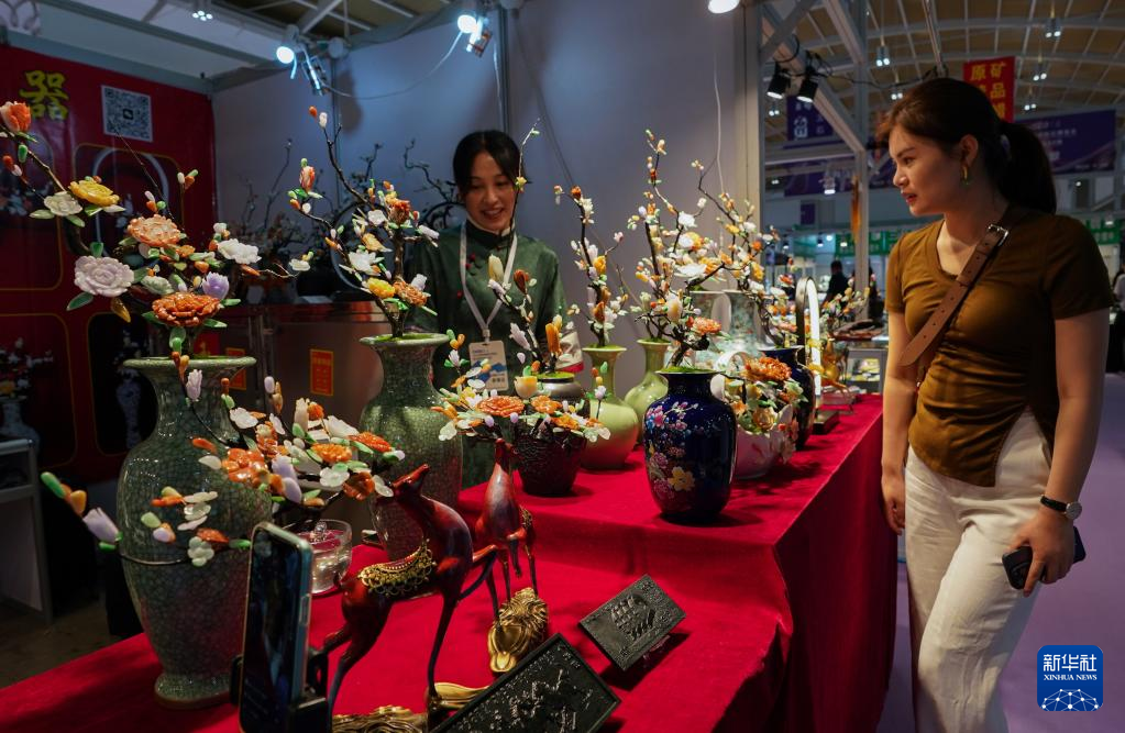 7月6日,一名參觀者(右)在石博會上觀看由玉石制作的插花。新華社記者 陳欣波 攝
