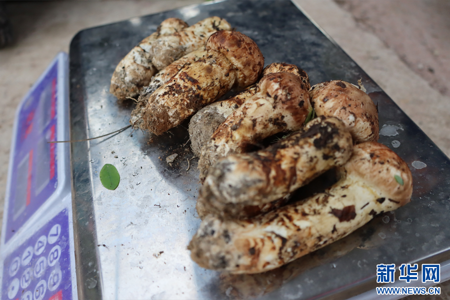 收購商給新鮮松茸稱重(7月4日攝)。新華網發(德欽縣融媒體中心供圖)