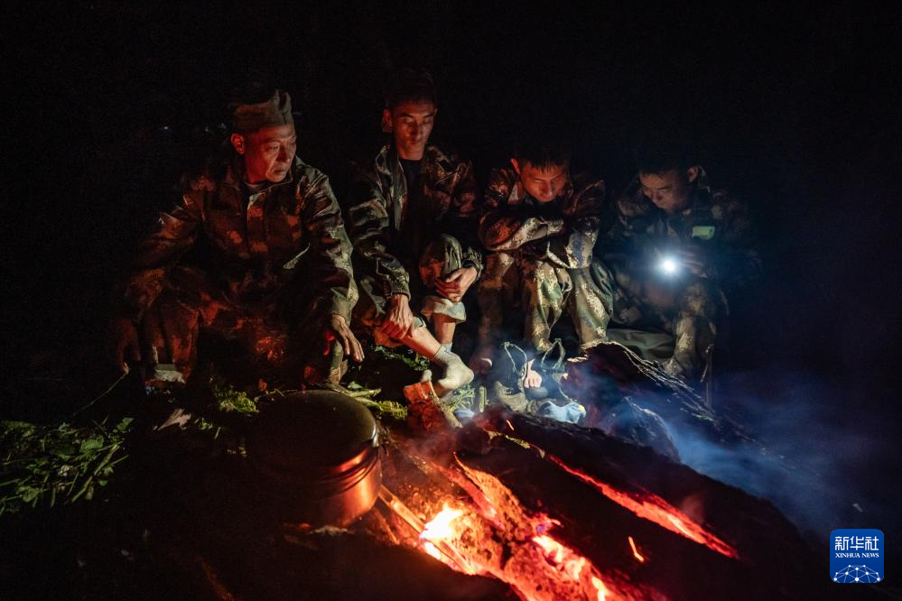 7月8日,在高黎貢山國家自然保護區,巡護隊員們在篝火旁烘干鞋襪。
