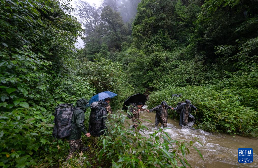 7月9日,在高黎貢山國家級自然保護區,巡護隊員相互幫助蹚過湍急的溪流。
