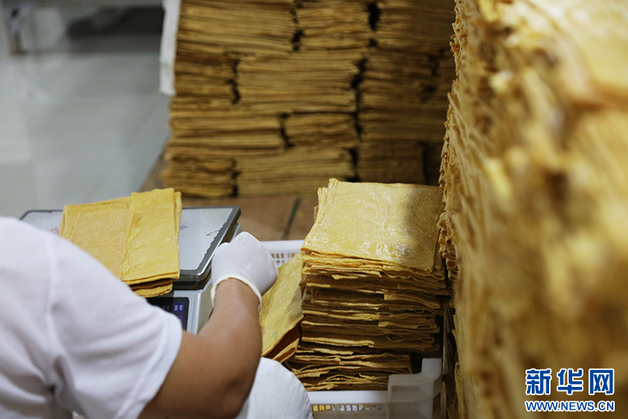 工人正在對豆腐皮進行稱重(攝于4月22日)。新華網 范芳鈺 攝