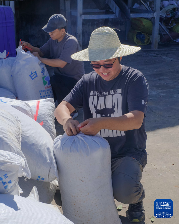 阿科(右)在云南省保山市潞江壩的有山咖啡莊園晾曬場和團隊伙伴將咖啡生豆裝袋(資料照片)。新華社發