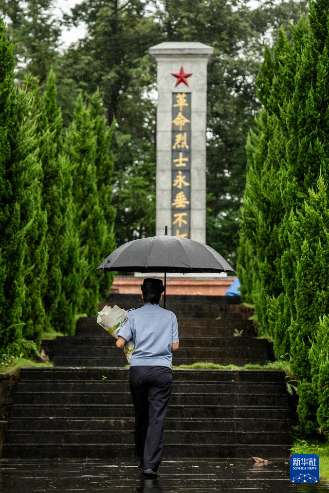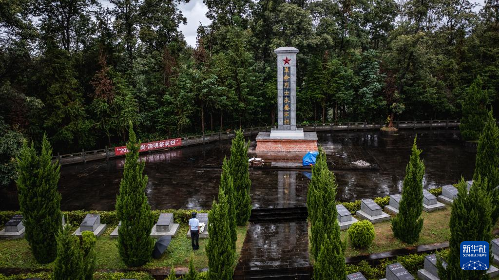 7月12日,尹銘燕在隴川縣烈士陵園祭奠犧牲的哥哥尹銘志(無人機照片)。