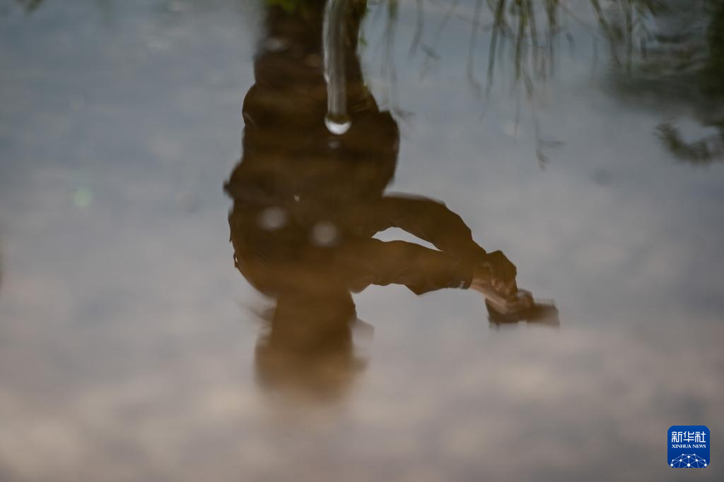 7月13日,尹銘燕在進行射擊訓練,地面的水洼映出她的倒影。