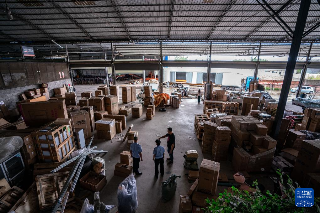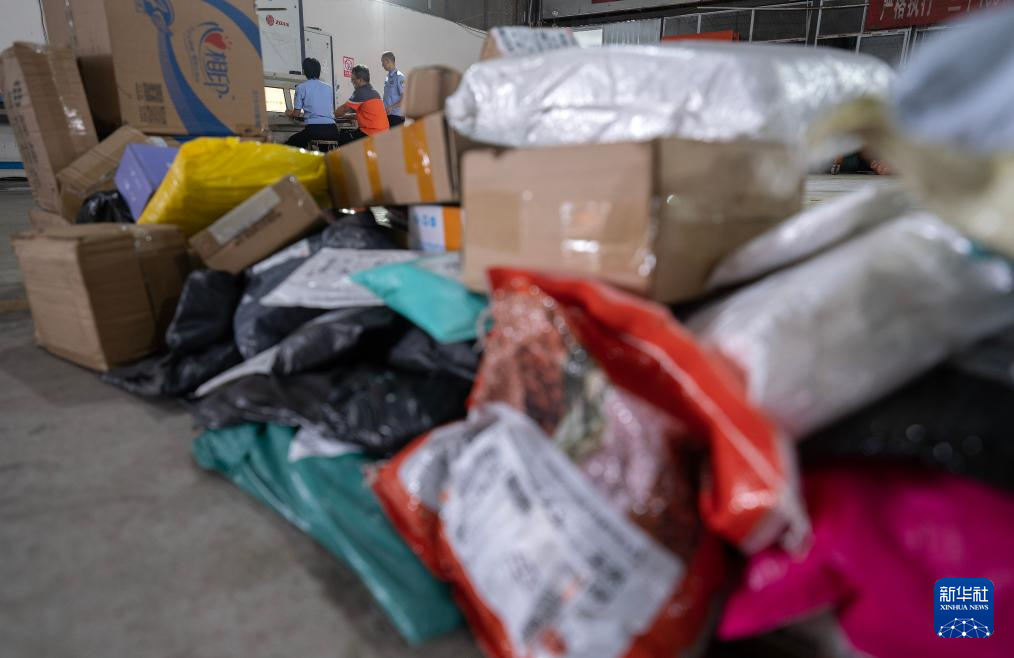 7月12日,尹銘燕(左)和同事在芒市一處物流點對快遞包裹進行查緝。