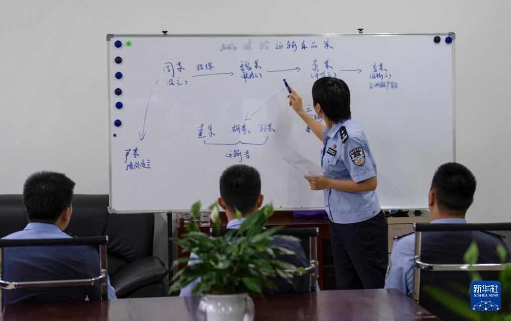 7月13日,尹銘燕(右二)和同事在模擬進行案情分析和推演。