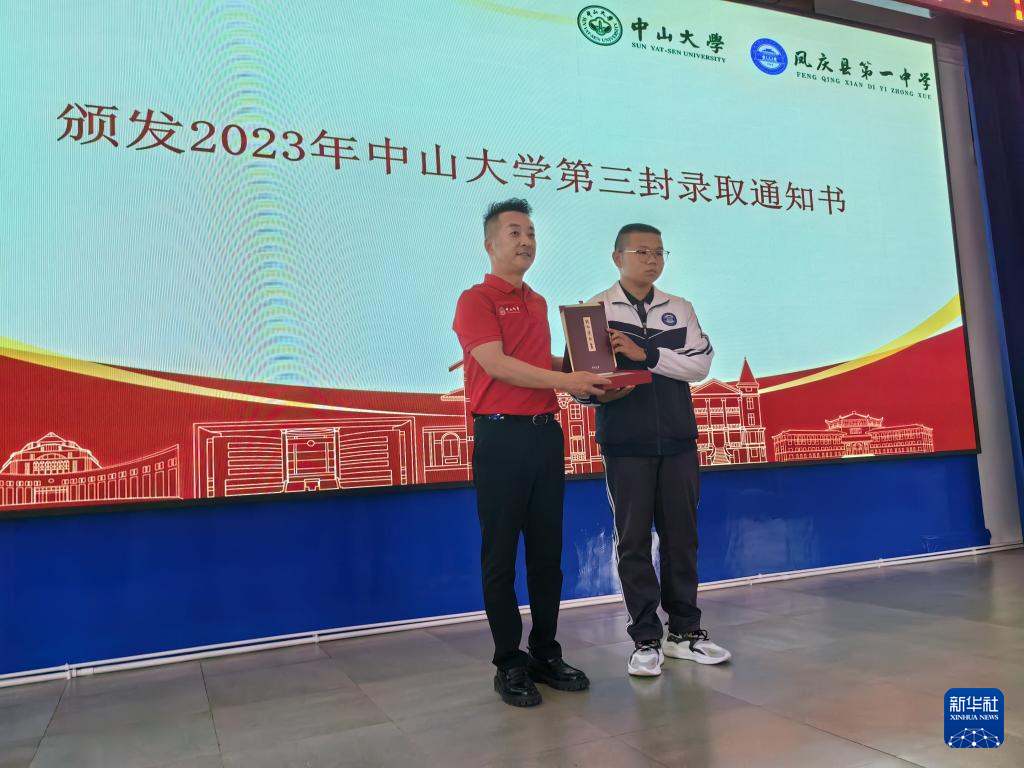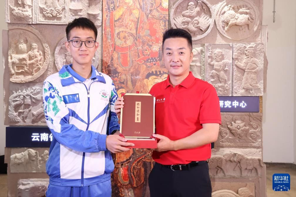 這是2023年中山大學全國第二封、云南首封錄取通知書,由中山大學掛職干部、臨滄市鳳慶縣副縣長張哲親手將其送到羅際航的手上。這個從小熱愛中華傳統文化的男孩,如今被中山大學中文系古文字學專業錄取。