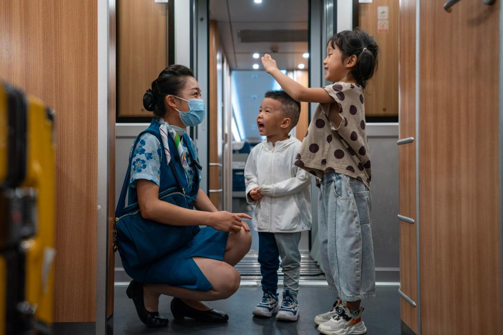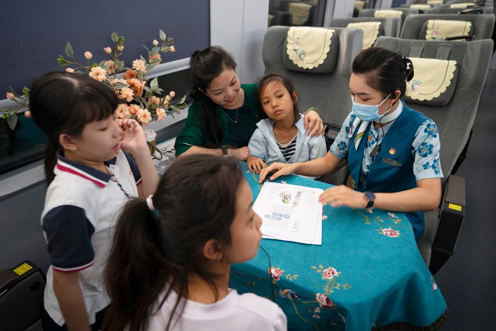 ↑依波逢(左一)在D887次列車上與小朋友互動(7月16日攝)。