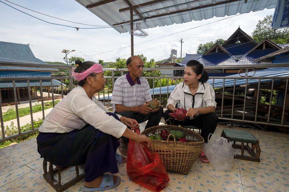 ↑7月16日,依波逢(右)從外公、外婆準備的水果中挑出幾個帶走,準備到勐臘縣城看望同學。