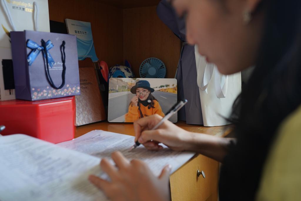 ↑依波逢在位于昆明的住處學習老撾語(7月15日攝)。