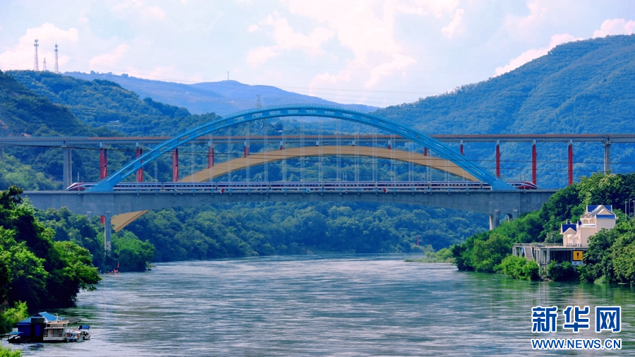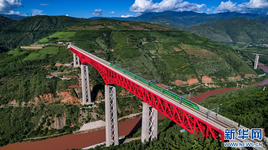 “綠巨人”行駛在中老鐵路元江特大橋上(資料圖)。新華網發(徐章位 攝)