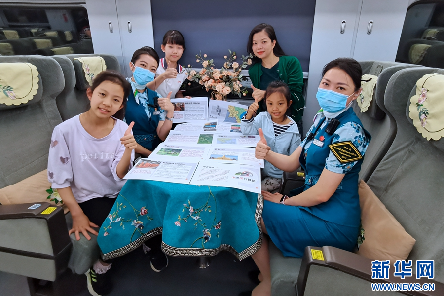 搭乘中老鐵路國際旅客列車的乘客與乘務員合影留念(資料圖)。新華網發(李婭嬌 攝)
