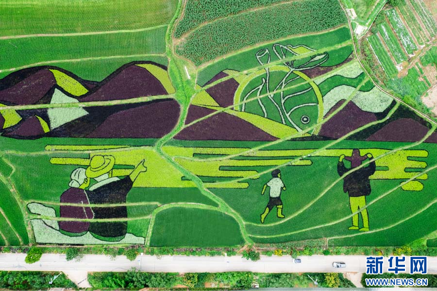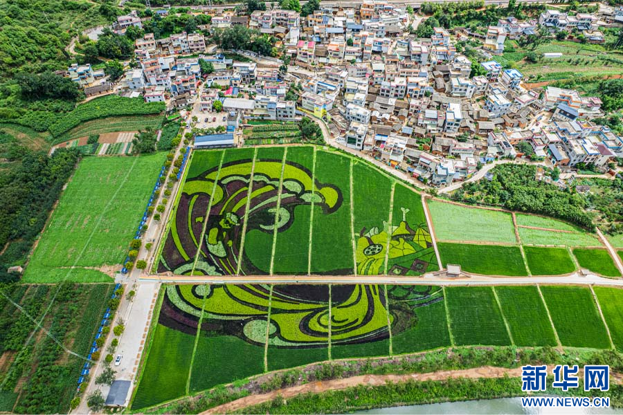 邑尾里村彩色水稻《如魚得水 幸福溫泉》(7月21日攝)。新華網發(安寧市融媒體中心供圖)