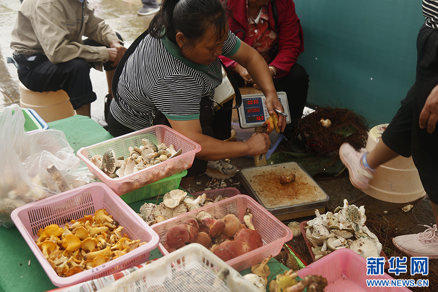 攤主為野生菌稱重(7月28日攝)。新華網發(馮雨釤 攝)