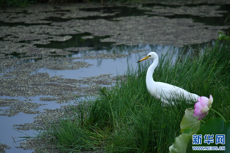 白鷺與荷花(7月21日 攝)。新華網發(蘇正強 攝)