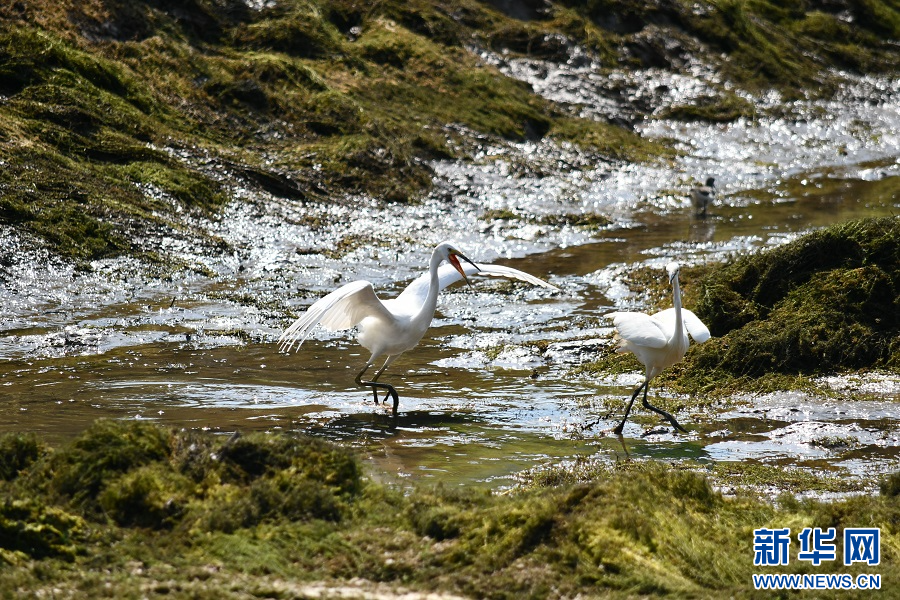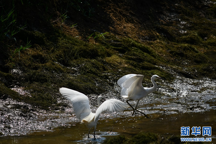 田埂邊嬉戲的白鷺(7月21日 攝)。新華網發(蘇正強 攝)