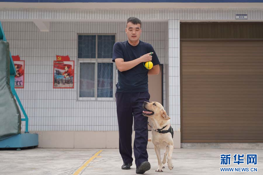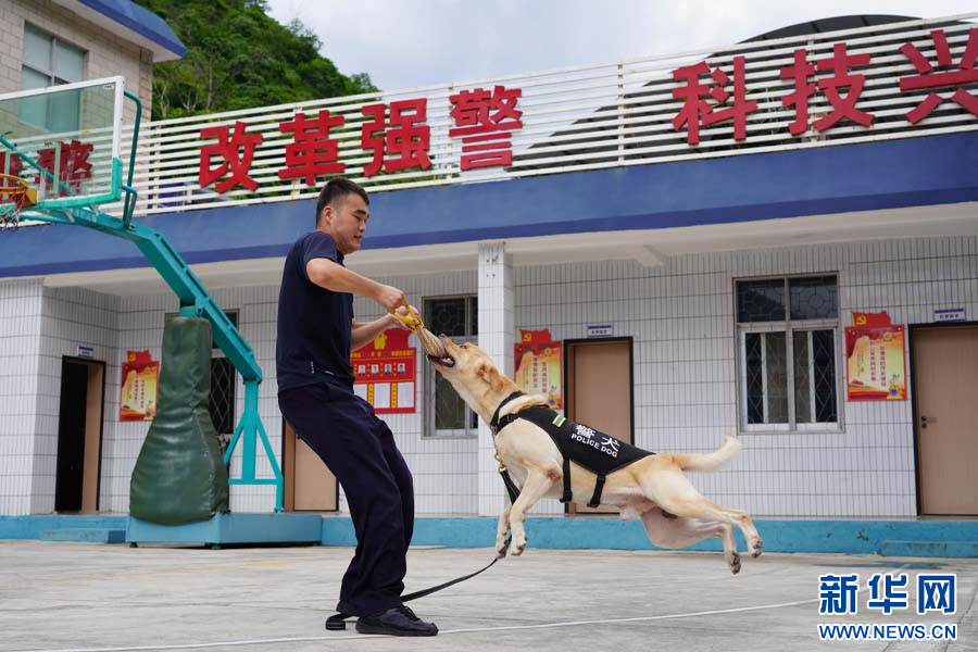 訓導員張濤開展隨行訓練(6月20日攝)。新華網發(花橋壩邊境檢查站供圖)
