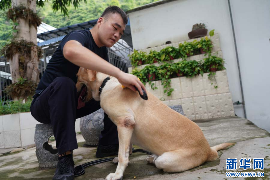 訓導員張濤給“天虎”梳毛(2月12日攝)。新華網發(花橋壩邊境檢查站供圖)