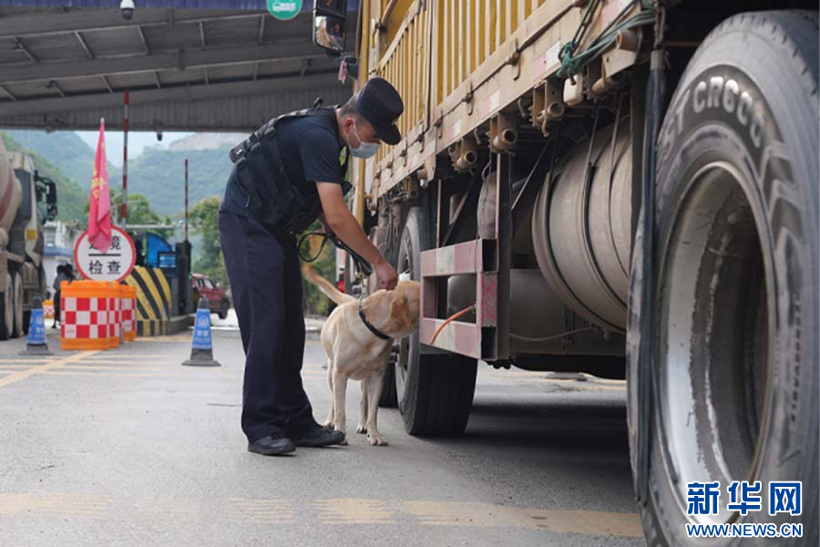 “天虎”對過往車輛進行檢查(8月7日攝)。新華網發(花橋壩邊境檢查站供圖)