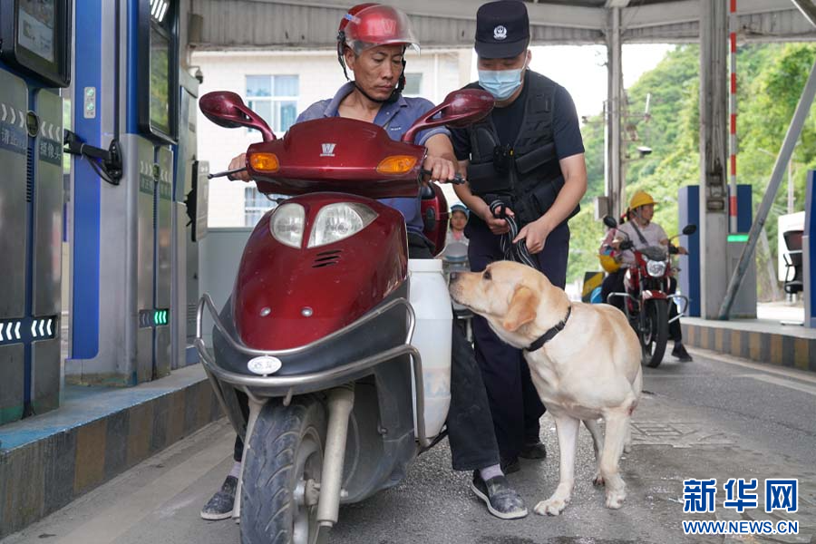 “天虎”對過往人員攜帶物品進行檢查(7月28日攝)。新華網發(花橋壩邊境檢查站供圖)