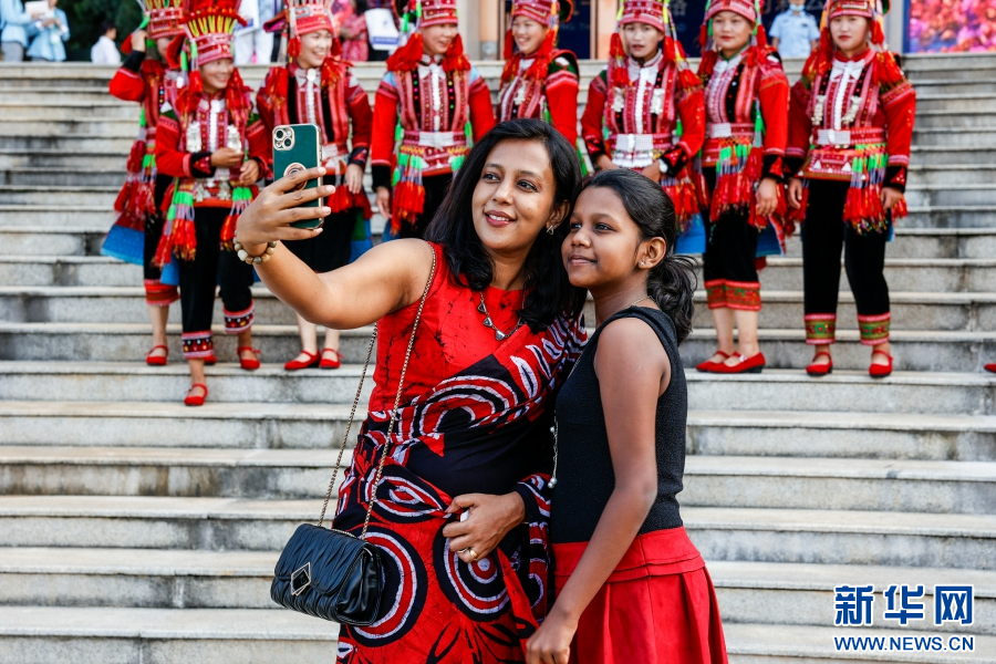 外國友人在中國舞蹈演員前自拍(8月15日攝)。新華網 趙普凡 攝