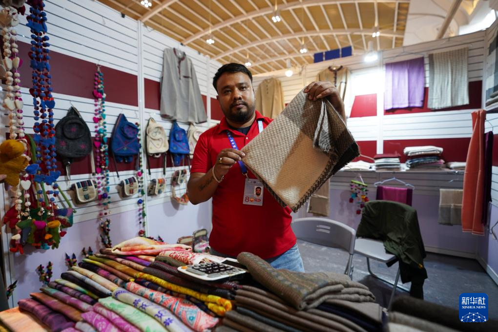在第七屆中國—南亞博覽會上,一名來自尼泊爾的展商在展示圍巾(8月18日攝)。新華社記者 陳欣波 攝