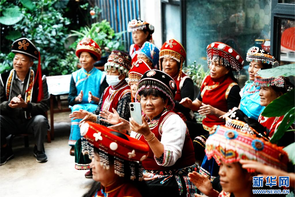 團頭聚面,載歌載舞。云南省大理白族自治州永平縣傈僳族刺繡傳習所內,晨曦溫和了院內各類繡品的斑斕色彩,30余位傈僳族繡娘正身著民族服飾歡聚一堂,用民族傳統舞蹈、音樂以及六味茶編織起儀式感,迎接著遠方客人的到來,同時也慶祝著本年度老年大學割繡班的結業。眾人環繞之下的余榮秀是割繡班的指導老師,同時也是大理州級非遺代表性傳承人與傳習所負責人。