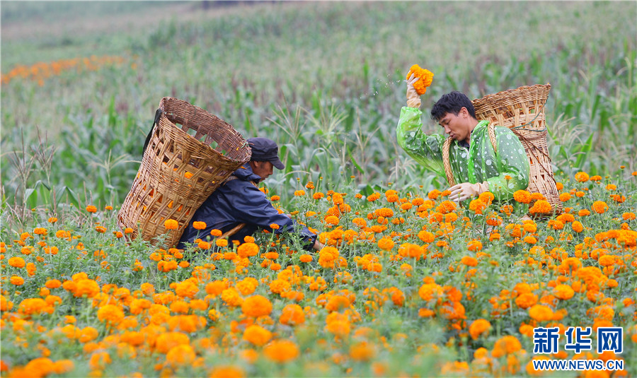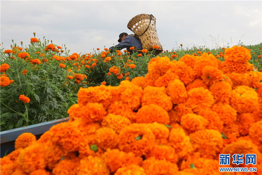 8月13日,云南省曲靖市沾益區白水鎮中心村,花農采摘萬壽菊。