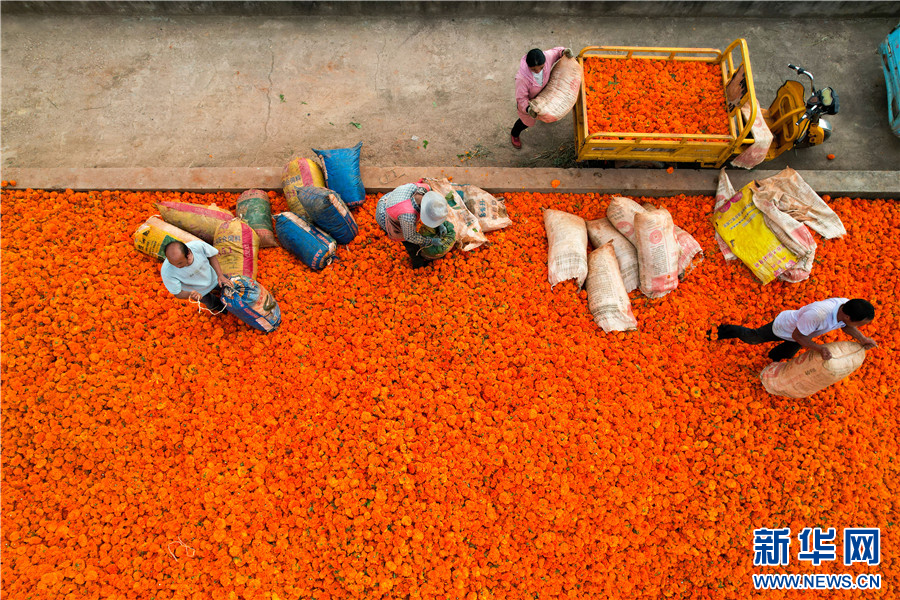 初秋時節,云南省曲靖市沾益區各地的水果、萬壽菊等作物迎來豐收,農民忙著采收、搬運、分揀、包裝、銷售,呈現出一派喜人的豐收景象。新華網發(楊俊鵬攝影報道)