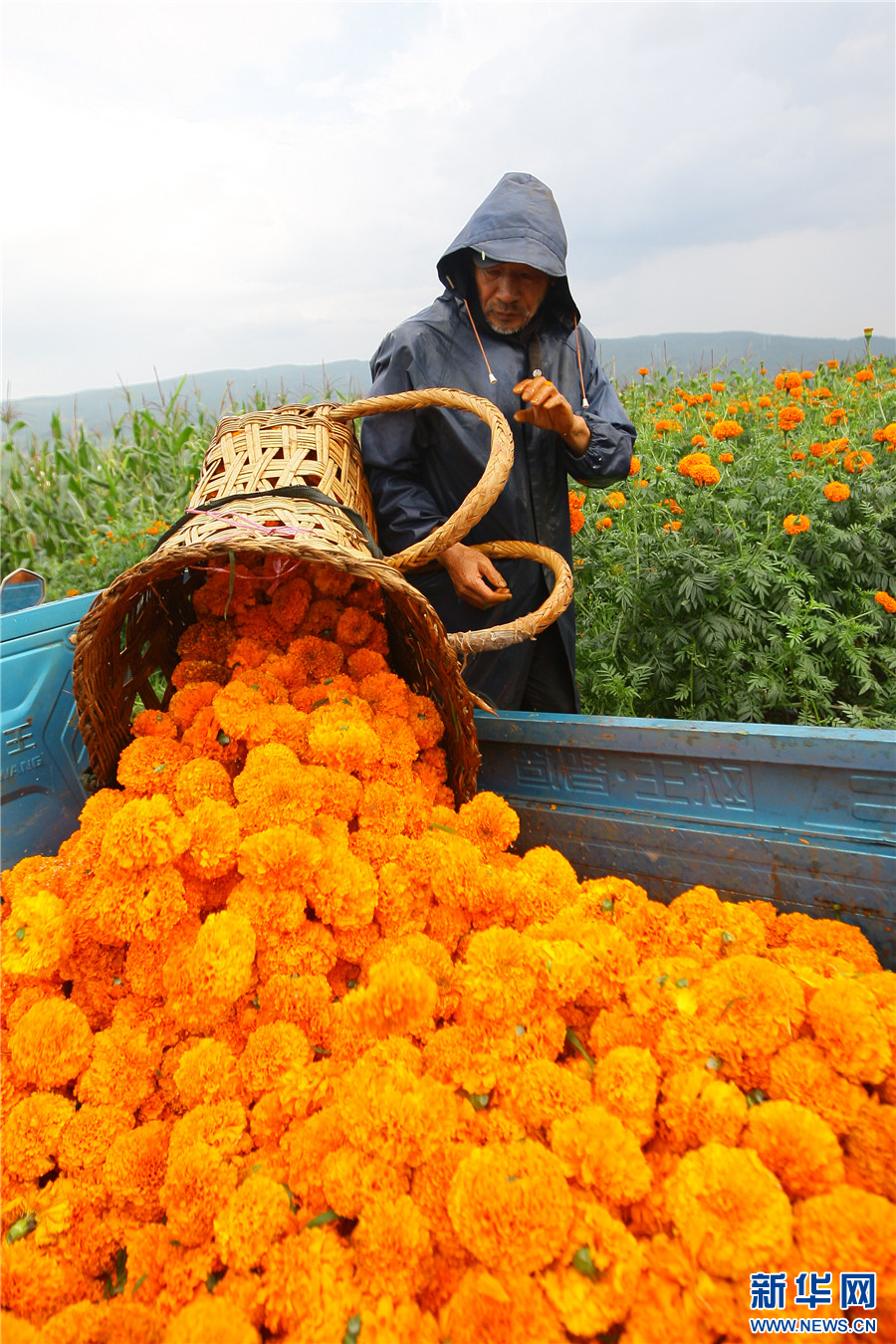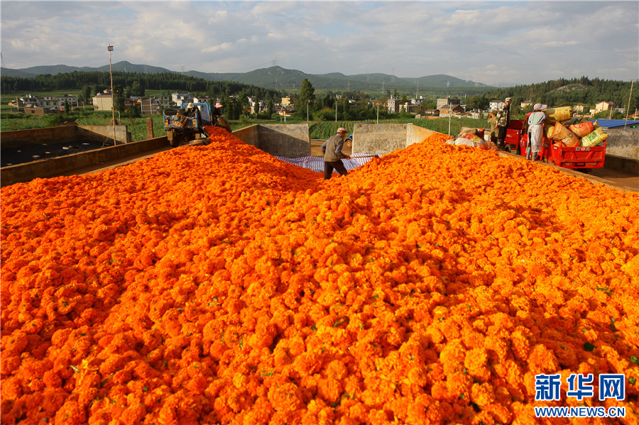 8月13日,云南省曲靖市沾益區白水鎮中心村,花農將萬壽菊倒入車箱。