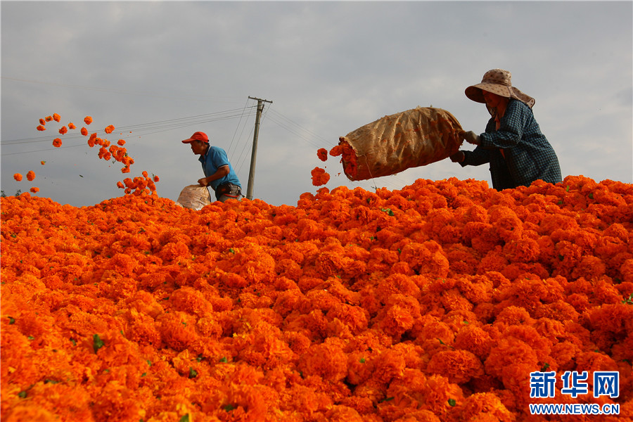 8月16日,云南省曲靖市沾益區大坡鄉大坡村萬壽菊收購點,花農將萬壽菊倒入花池。