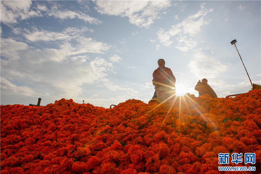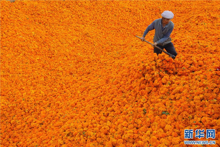 8月13日,云南省曲靖市沾益區白水鎮勺達村萬壽菊收購點,工作人員在花池內整理萬壽菊。