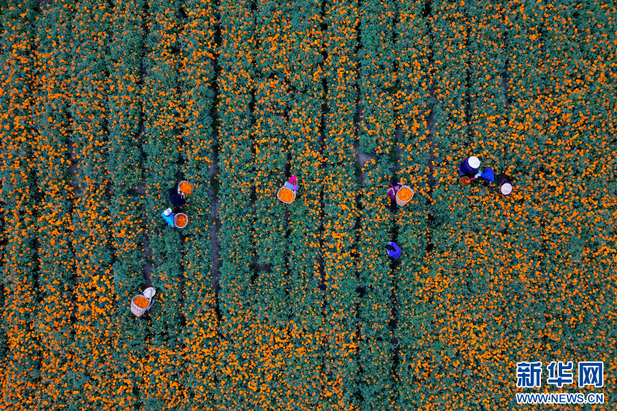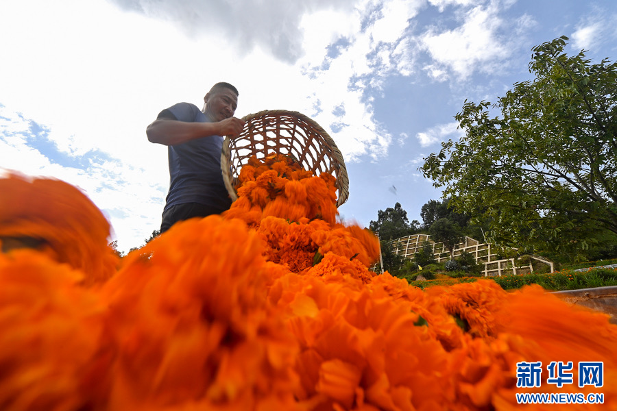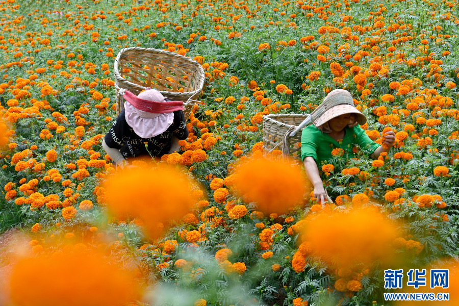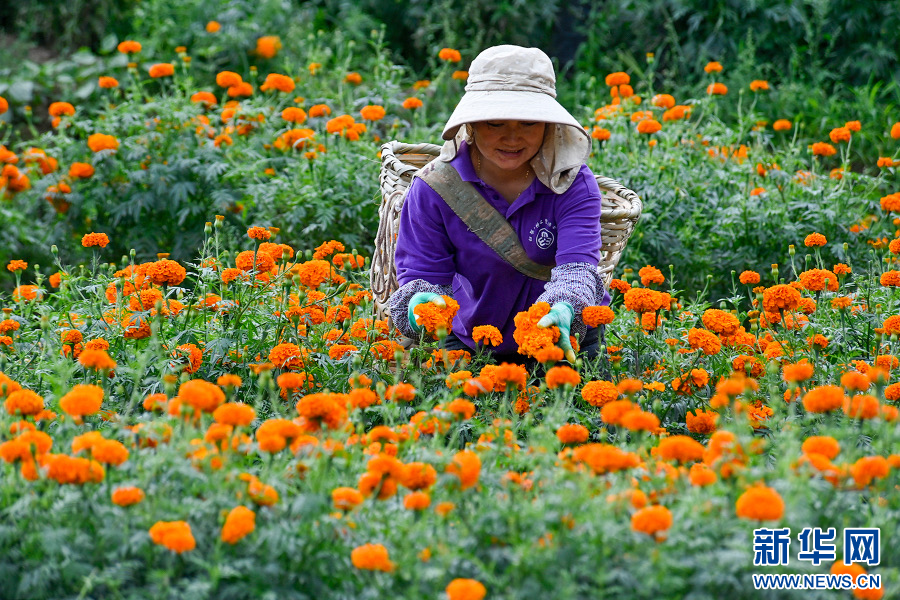 村民采摘萬壽菊(8月17日攝)。新華網發(適志宏攝)
