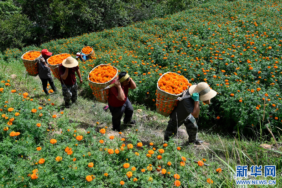 村民們搬運摘下的萬壽菊(8月17日攝)。新華網發(適志宏攝)