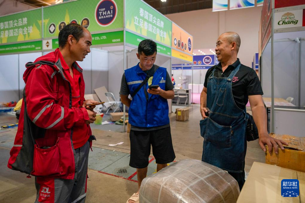 陳杰(右)在第七屆中國-南亞博覽會結束后與兩家快遞公司員工商量寄送快遞價格(8月20日攝)。