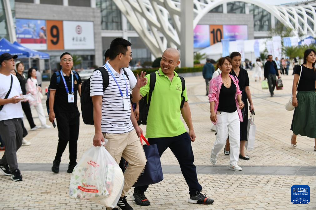 陳杰(著綠衣者)結束一天在展位的工作后和同伴一起回酒店(8月18日攝)。