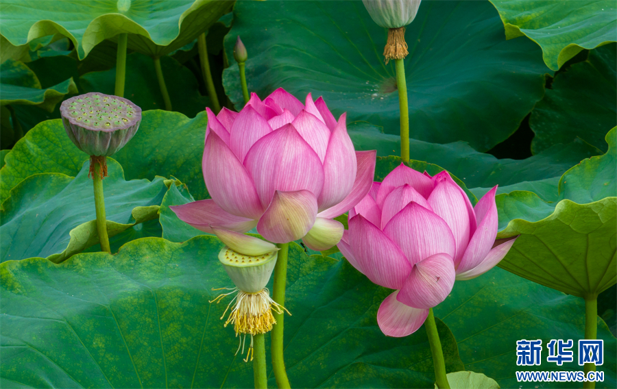 荷花與蓮蓬相互映襯(8月23日攝)。新華網發(宋光旭 攝)