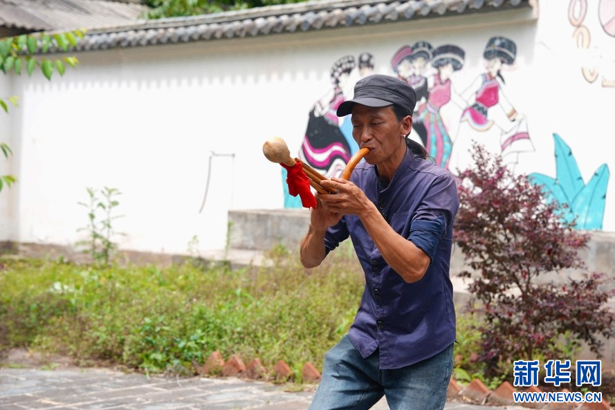 圖為丁紹榮表演葫蘆笙演奏與傈僳族打歌技藝。(張藝馨 攝)