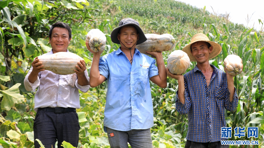 農戶展示豐收的南瓜(8月24日攝)。新華網發(施甸縣融媒體中心供圖)