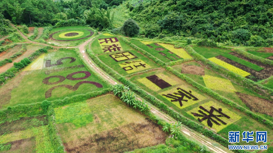 彩色稻田里“民族團結一家親”字樣(8月22日攝)。新華網發(陶平 攝 )