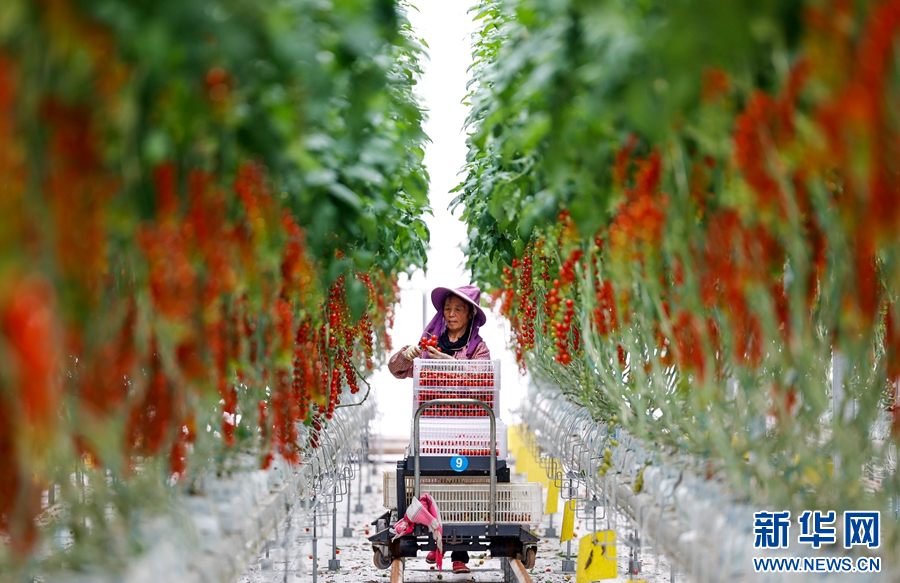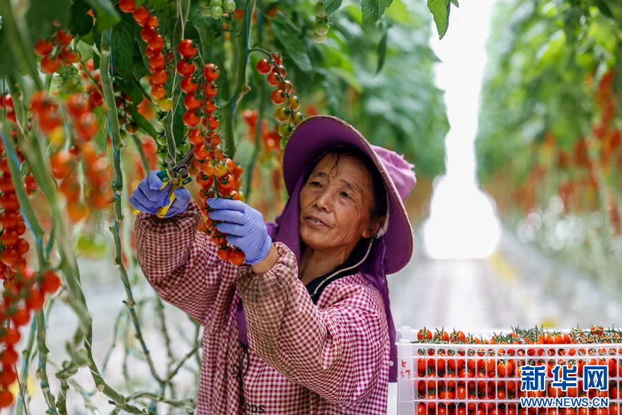 “棚長”李二香正在采摘櫻桃番茄(攝于7月13日)。(新華網 趙普凡 攝)