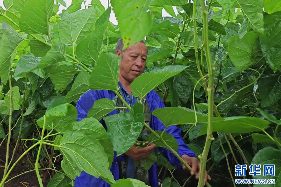 蠶農在桑田內采摘桑葉(8月30日攝)。新華網發(蘇波 攝)