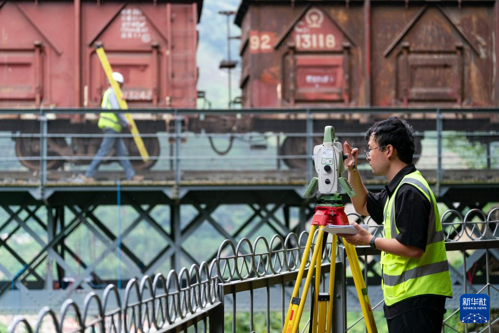 9月6日,鐵科檢測有限公司工作人員在人字橋橋面測量。