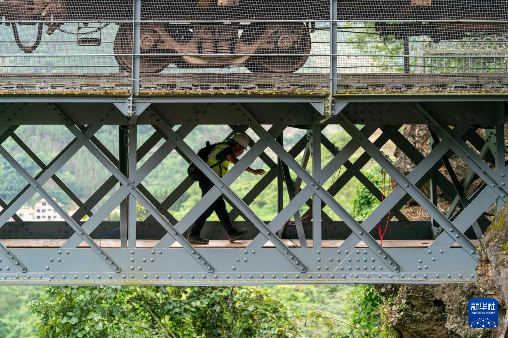9月6日,鐵科檢測有限公司一名工作人員在人字橋鋼架間穿行。