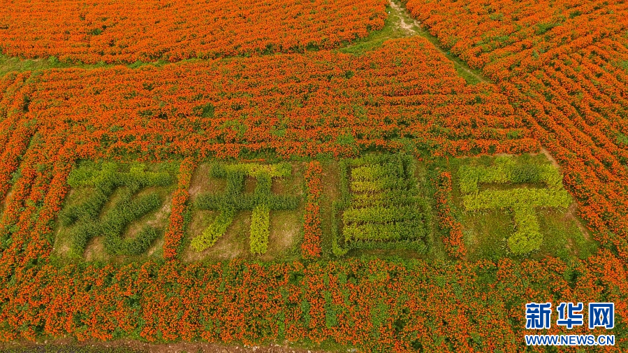 航拍鏡頭下萬壽菊花田里“花開昌寧”字樣(9月6日攝)。新華網發(劉子安 攝)