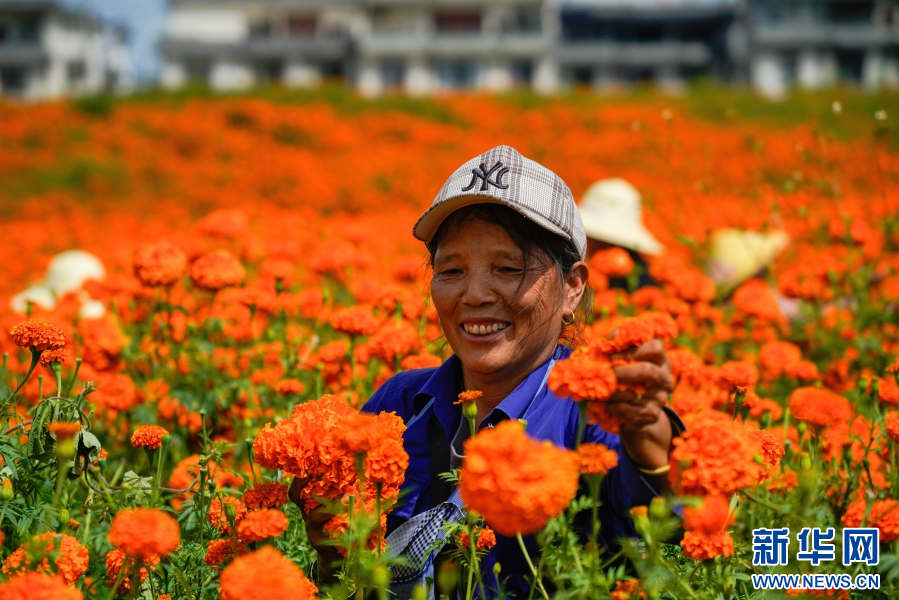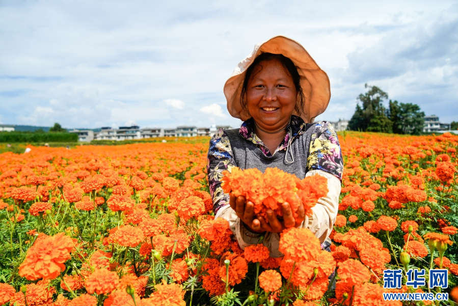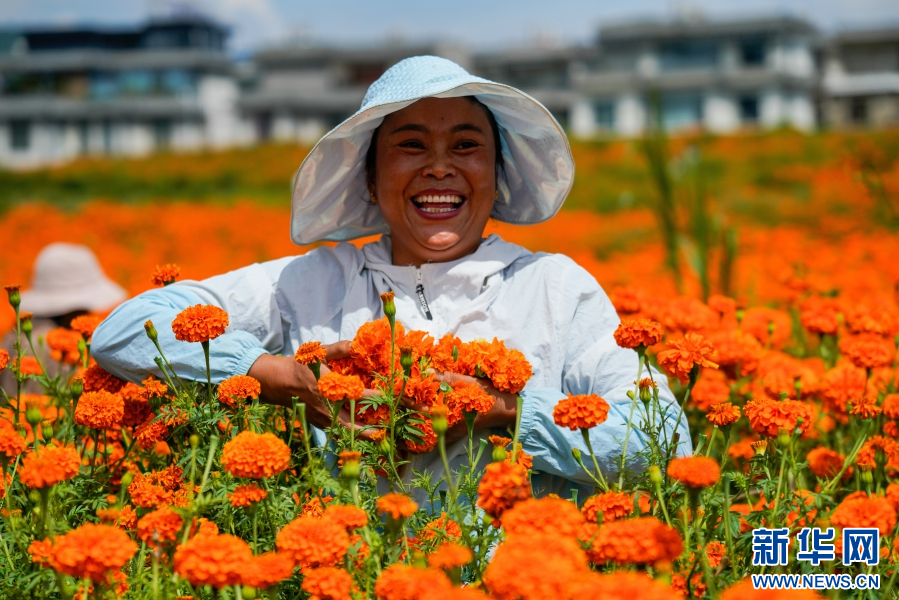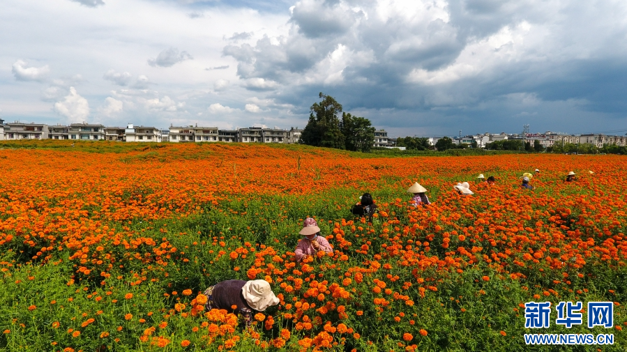 工人采收萬壽菊(9月6日攝)。新華網發(劉子安 攝)
