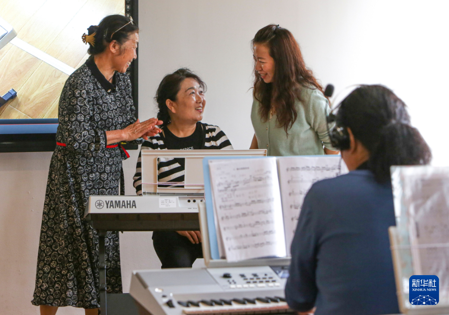 在云南老年大學的電子琴即興伴奏課上,老師(左三)在對學生進行輔導(9月7日攝)。新華社記者 崔文 攝