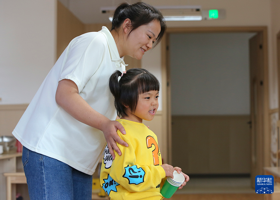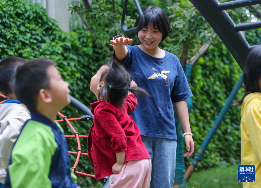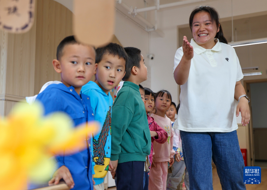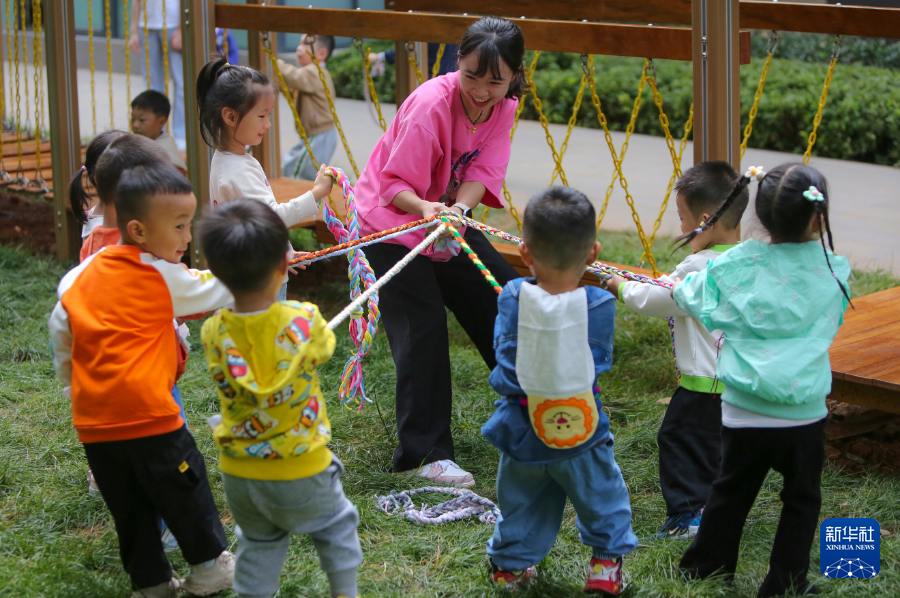 在云南省昆明市西山區前衛幼兒園,老師在和小朋友們做游戲(9月6日攝)。新華社記者 崔文 攝