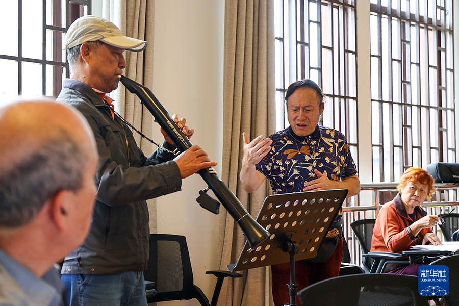 在云南老年大學的電吹管課上,老師(右二)在為學生打節拍(9月7日攝)。新華社記者 崔文 攝